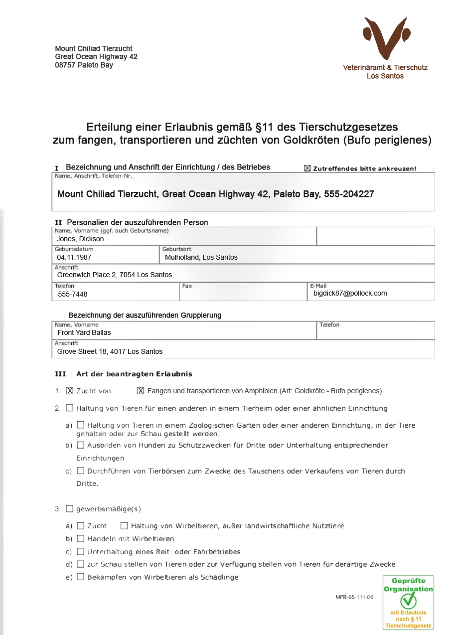 hätte da eine kleine Frage und zwar, ist mir mal vor paar Wochen zu Ohren gekommen von einem Mitbürger, er habe eine Lizenz um das Krötenfeld betreten zu können sowie die Kröten transportieren zu können. Dies war natürlich zuerst IC-Bezogen. Nach einer Kopfschmerz Attacke sind wir in der ersten Lobby gelandet und haben da mal bisschen gequatscht und er meinte er habe da eine eigene Lizenz via Paint angefertigt die er bei Kontrollen des LSPD´s in einer Roleplay-Situation vorzeigen kann und weiter fahren darf.