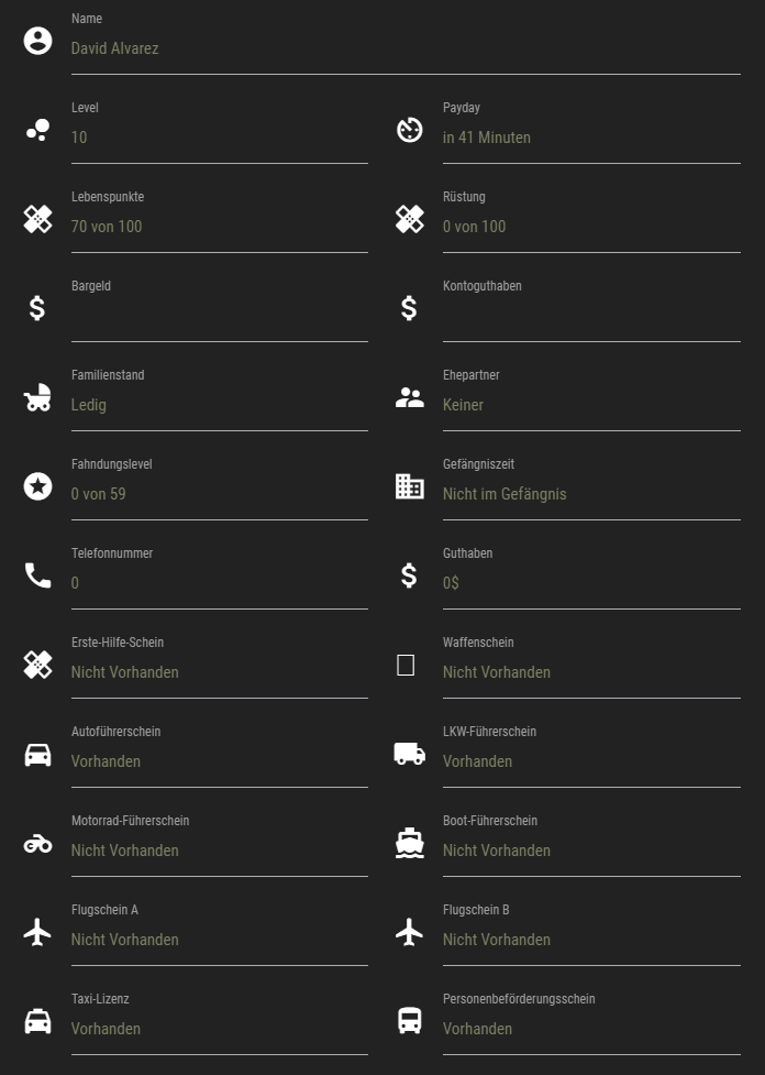 Mein Name ist David Alvarez, ich bin 30 Jahre alt und lebe seit etwas über 10 Jahren in Los Santos. Nachdem ich mich die ersten zwei Jahre als Gärtner über Wasser gehalten habe und so viel wie möglich meines Einkommens bei Seite gelegt hatte, konnte ich vor nun schon 7 Jahren meinen PKW Führerschein und den Personenbeföderungsschein (PBS) erwerben. Ich verschaffte mir daraufhin die Taxi Lizenz und mietete mir von einem befreundeten Taxifahrer sein Taxi, wenn er nicht selbst im Dienst war. So konnte ich schnell viele Leute und auch abgelegene Teile unserer schönen Insel kennenlernen.