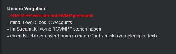 Soll ja nicht so werden das die GVMP Streamer dann nur 3 std die Woche GVMP Streamen und die restliche Zeit auf anderen Server daddeln und trotzdem die Vorteile hier genießen.