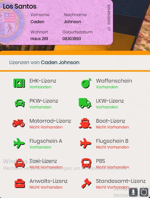 Personalien Name: Caden Johnson GWD - Note: noch nicht erhalten (Sonntag) Telefonnummer: 79558 Wohnort: Vinewood Hills Sozialstufe: 38 Kopie der Lizenzen und des Personalausweises
