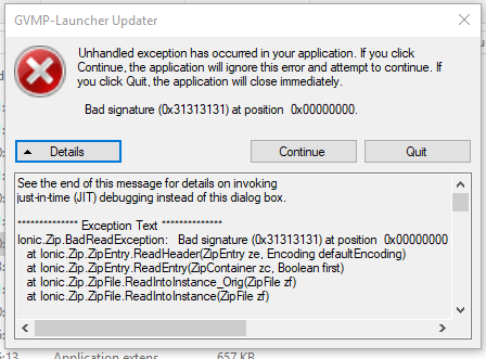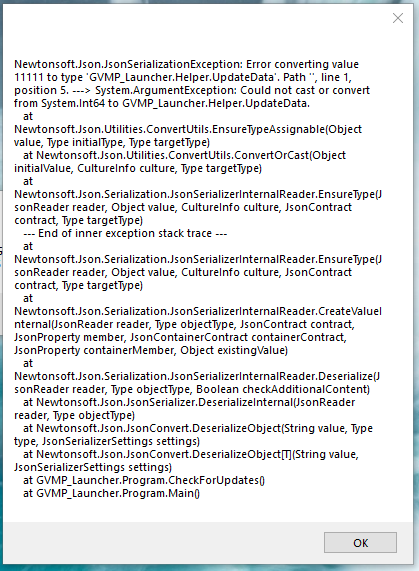 Ich downloade mir die WinRar-Datei, die zu Verfügung gestellt wird, runter und extrahiere sie auf dem Desktop. Ich starte den GVMP Launcher und wähle meinen (korrekten) Pfad für RageMP und GTA5 aus. Allerdings bekomme ich dann eine Errormeldung, welche unten im Spoiler angehängt ist.